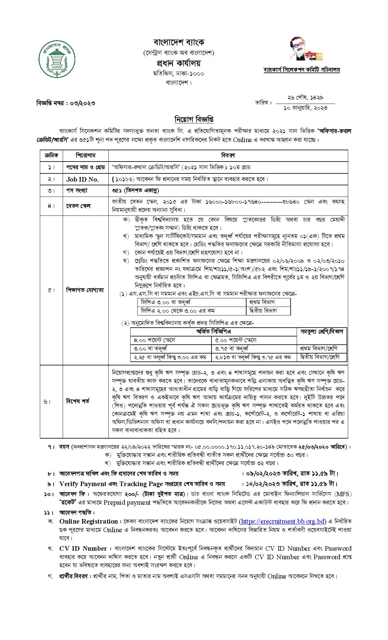 বাংলাদেশ ব্যাংক, পদ সংখ্যাঃ ৩৫১টি।